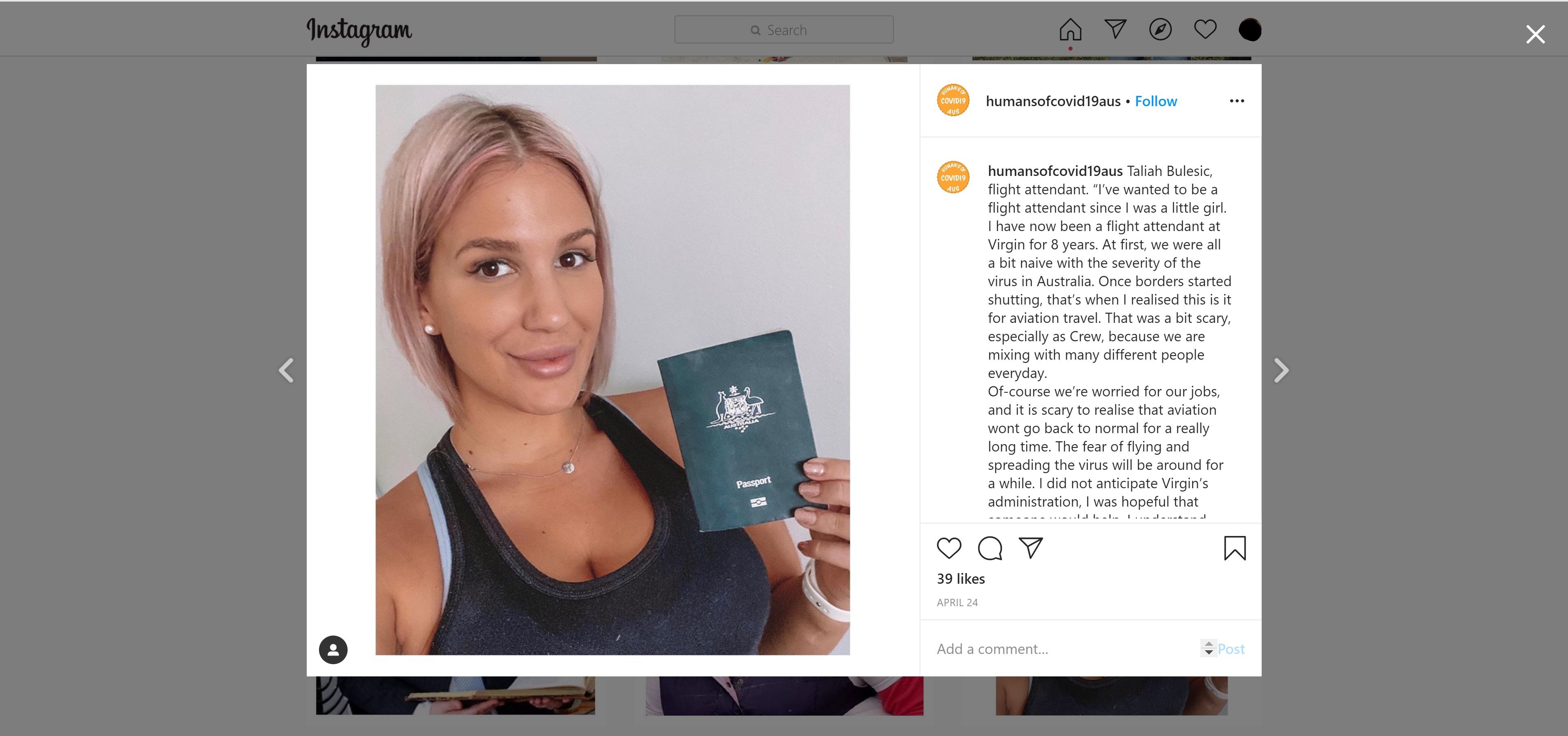 Instagram post on Taliah Bulesic, flight attendant, and her experience during the pandemic, which was created by a psychology student living in Melbourne who was interested to hear about how COVID-19 was impacting on different peoples’ lives.
