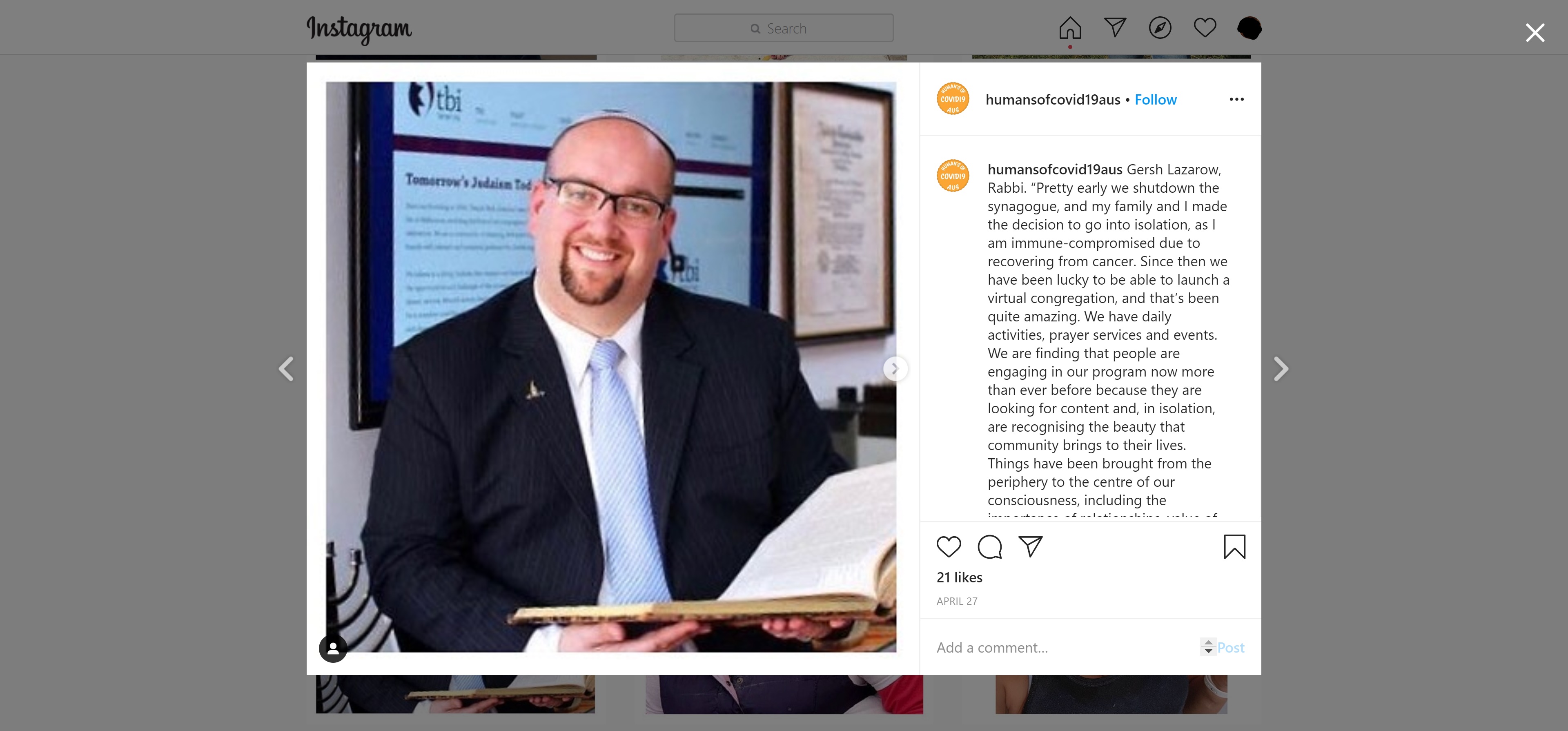 Instagram post on Gersh Lazarow, Rabbi, and his experience during the pandemic, which was created by a psychology student living in Melbourne who was interested to hear about how COVID-19 was impacting on different peoples’ lives.