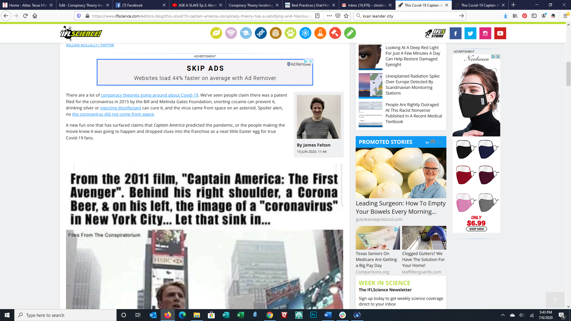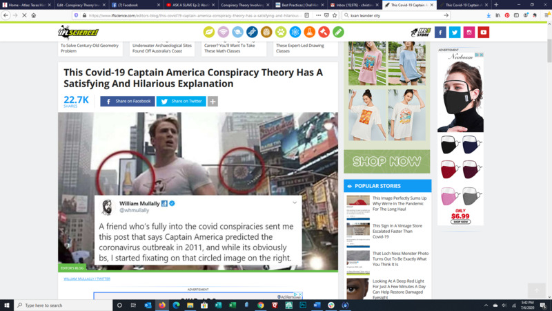 Since COVID-19 was an unprecedented event, people tried hard to understand its cause. Many conspiracy theories cropped up. This one claimed that the virus was predicted by the movie Captain America. Here he is shown in Times Square, New York, with a bottle of Corona beer in lights and what could be seen as an atom of the virus. These two elements "prove" that the virus was released into the population. Of course, the virus has nothing whatsoever to do with the beer--it was named corona due to the halo surrounding each virion.