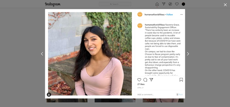 Instagram post on Raveena Grace, Sustainability Engagement Officer, and her experience during the pandemic, which was created by a psychology student living in Melbourne who was interested to hear about how COVID-19 was impacting on different peoples’ lives.