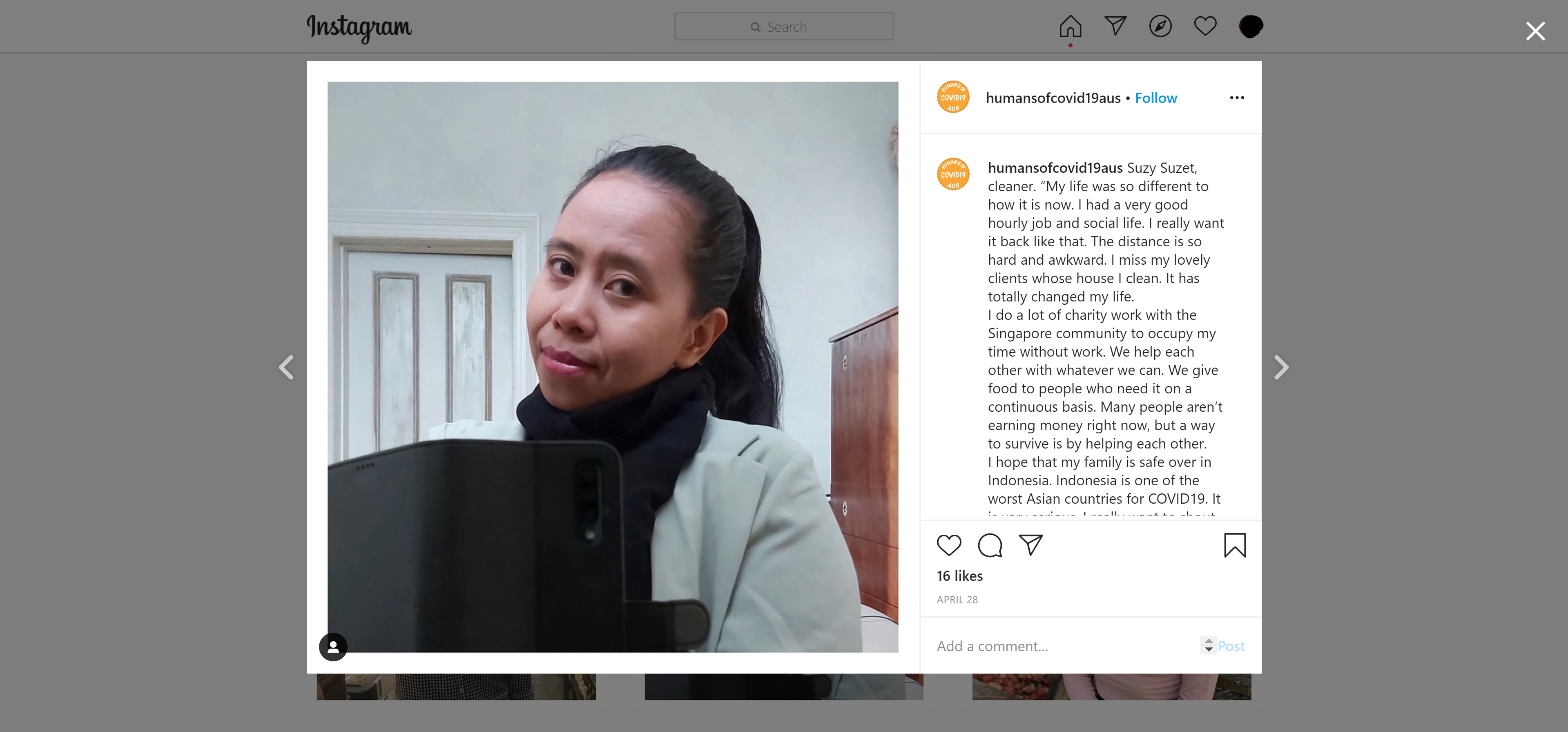 Instagram post on Suzy Suzet, cleaner, and her experience during the pandemic, which was created by a psychology student living in Melbourne who was interested to hear about how COVID-19 was impacting on different peoples’ lives.