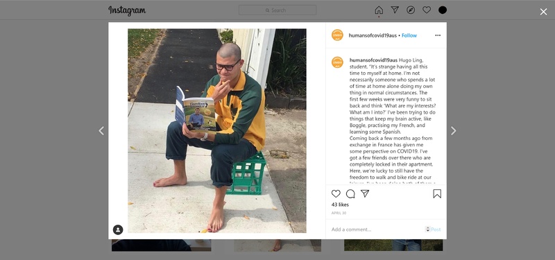 Instagram post on Hugo Ling, student, and his experience during the pandemic, which was created by a psychology student living in Melbourne who was interested to hear about how COVID-19 was impacting on different peoples’ lives.