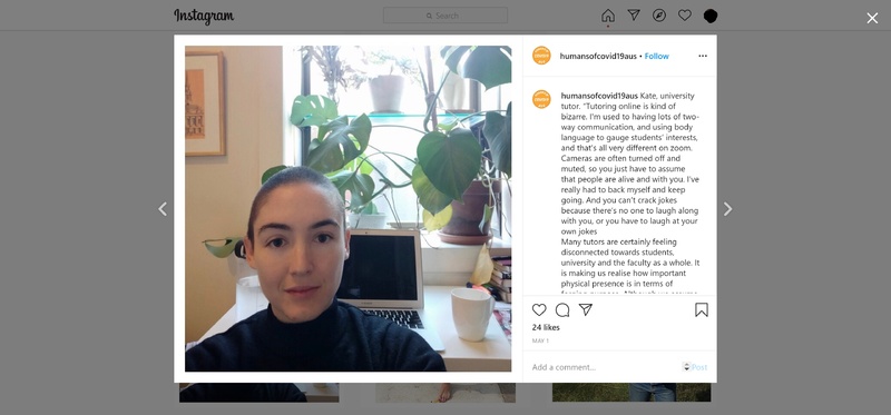 Instagram post on Kate, university tutor, and her experience during the pandemic, which was created by a psychology student living in Melbourne who was interested to hear about how COVID-19 was impacting on different peoples’ lives.
