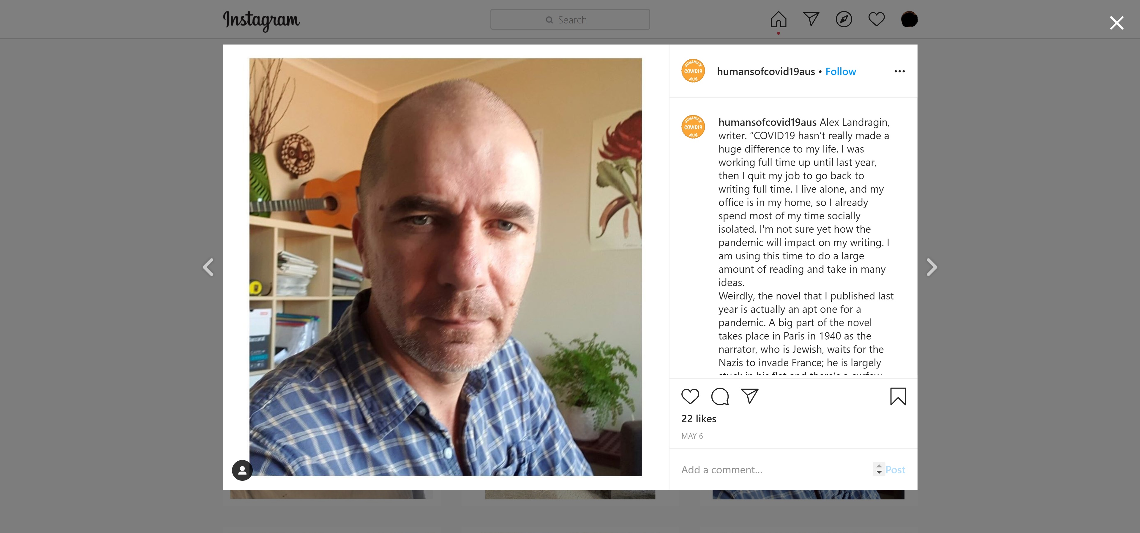 Instagram post on Alex Landragin, writer, and his experience during the pandemic, which was created by a psychology student living in Melbourne who was interested to hear about how COVID-19 was impacting on different peoples’ lives.