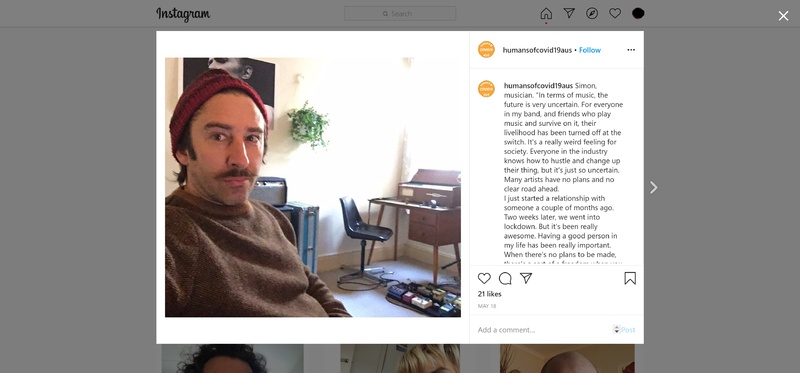 Instagram post on Simon, musician, and his experience during the pandemic, which was created by a psychology student living in Melbourne who was interested to hear about how COVID-19 was impacting on different peoples’ lives.