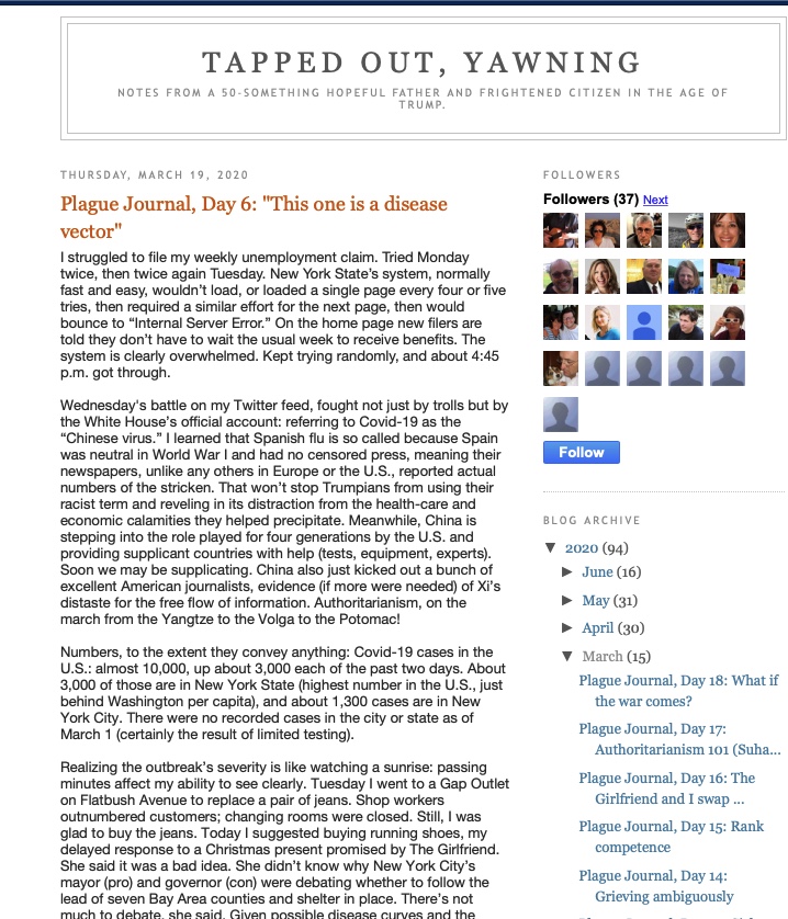I'm keeping a Plague Journal, here is today's entry: I struggle to file my unemployment claim in an overwhelmed system; Trumpians trot out a racist description of Covid-19; I work to grasp the virus's severity with everything from face touching to pants buying; and The Girlfriend and I walk and jog through Bed-Stuy.