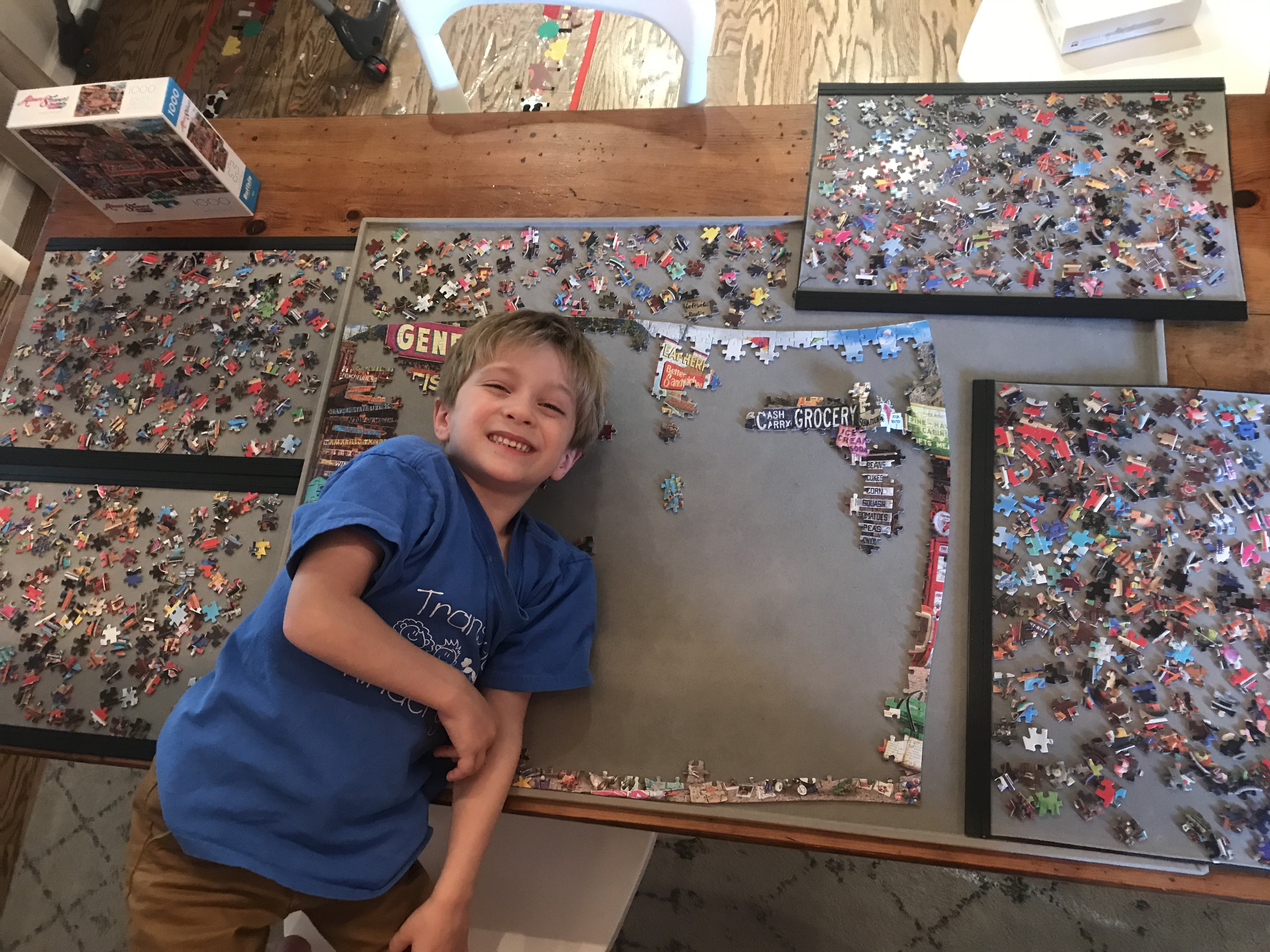 Immediately after he finished his first ever 1000 piece puzzle, he asked to do another one! He took a much more active role in sorting the pieces for this puzzle. It is so fun to lose ourselves in puzzling. It takes our minds off of the gravity of the world in which we live. Just looking at this photo, it is hard to believe that we are living in the middle of a pandemic.