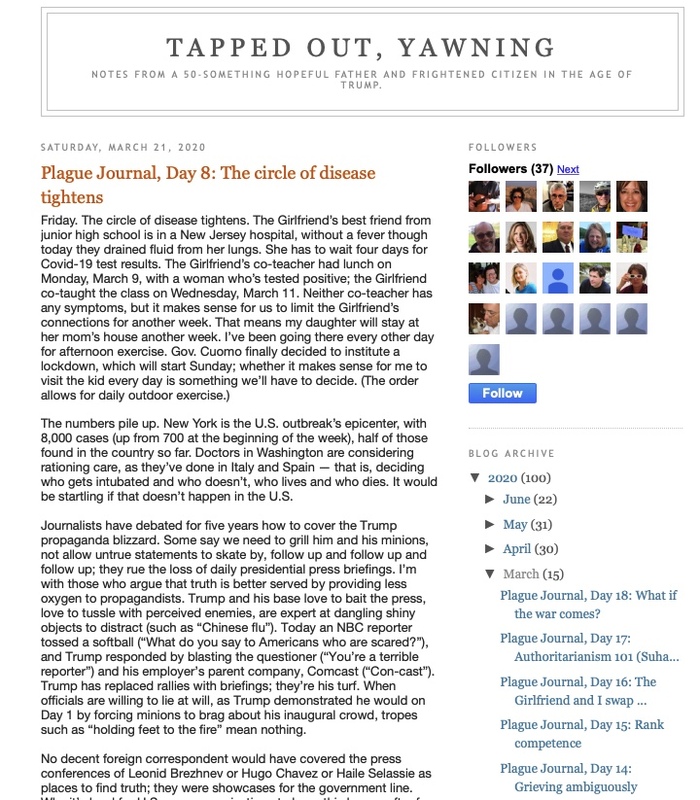The Girlfriend's friend enters the hospital with lung problems, awaits test results; also, her colleague is a possible Covid-19 vector. The Girlfriend experiences tension with her mother in a nursing home, her children at her apartment. Meanwhile, my mother adjusts to her new isolation.