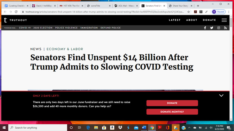 This is a news article discussing the U.S. president purposely slowing the Covid testing.The president thinks if we test less we will have less positive coronavirus cases.The idiocy of Trump trying to slow tests is why the United States has the largest amount of coronavirus cases.It makes me angry that he could not use funds allocated for testing and he should be held accountable for it.it is honestly disgusting and people are paying for his foolishness and pride with their lives.