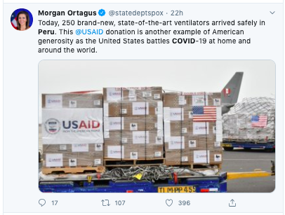 I didn't realize there were organizations coordinating the production and distribution of medical supplies to send abroad, it seemed like just a few months ago we couldn't even get states to agree to share supplies. I'm wondering where these ventilators will go, or if they won't even make it out of Lima. The comments and replies seemed laudatory for the president, but nothing too significant, so I didn't screenshot them. Tweet text: Today, 250 brand-new, state-of-the-art ventilators arrived safely in Peru. This