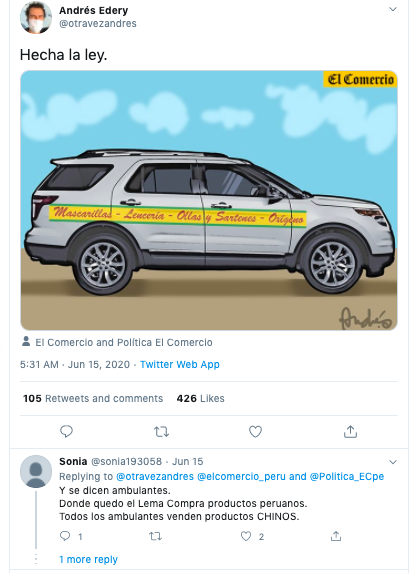A political cartoon about new restrictions on ambulatory sales. Prior to the pandemic, Peru had an economy where lots of people could purchase and sell products like ambulatory salespeople, moving around buses and neighborhoods freely carrying their products. Now however, salespeople aren't allowed to walk around or sell on foot, they have to sell out of their car. It offers some relief to those who actually have access to a car, but for those who don't and aren't earning money, the economic challenge of survival is a greater threat than the virus.