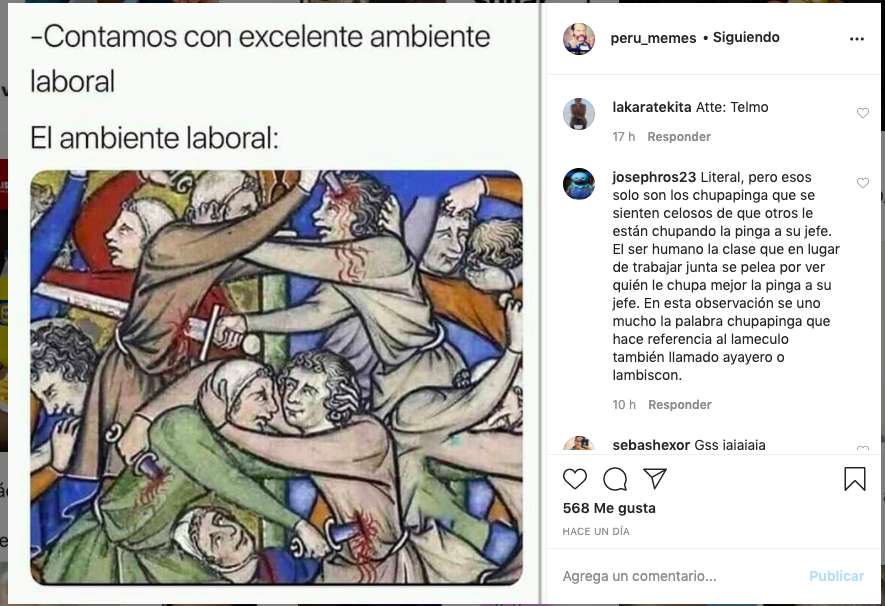A meme posted about the cutthroat labor system in Peru, it's true that there's a lot of competition in certain sectors. In some cases, vendors barely make a profit because everyone is trying to offer the lowest price just to make the sale. I often had this conversation with my mother in law who sold clothing on consignment, I understand that consignment is a normal practice, but if you have to take a bus/taxi to someone's house 3 or 4 times to collect installments, the minimal profits you were making are essentially erased. Now that Peru is allowing some vendors to start selling again, it's once again a volatile and competitive environment because so many people have been without work and the basic necessities.