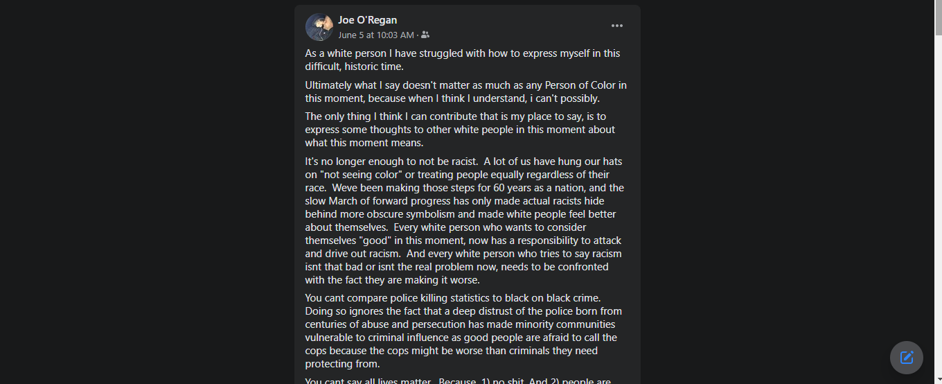 There is a lot there, and so much more I havent even touched. If anyone wants to discuss these points privately, without judgement, feel free to message me. My biggest regret right now is all my life I have tried to be a good friend to the people of color in my life, but I have failed because I have not done enough to be a good Ally, what they actually deserved. But this moment isn't about me or any other white persons guilt, it is about what we will do now to step up and fix an obviously broken system.