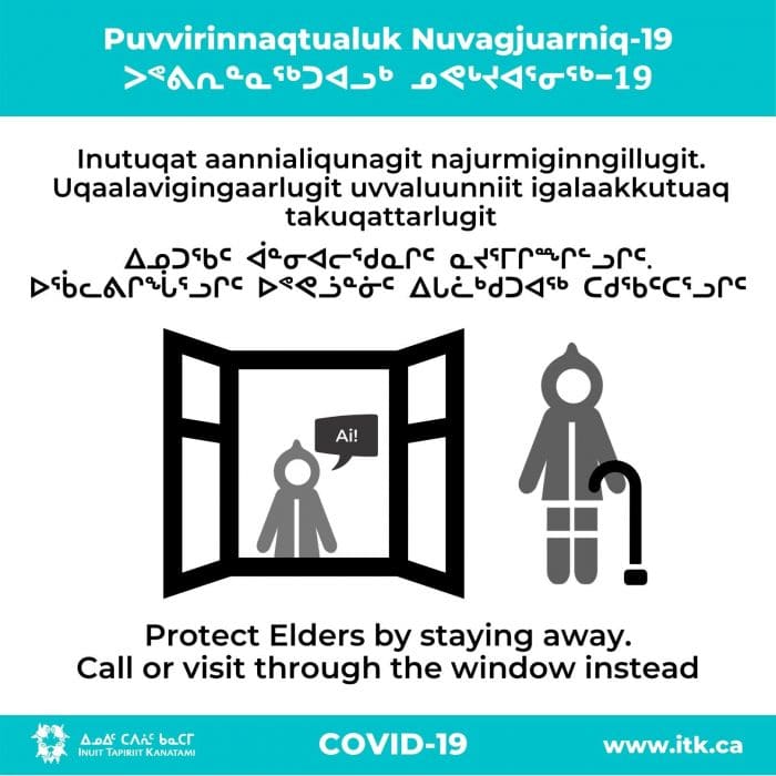 "Protect Elders by staying away. Visit through the window instead." Poster in English and Inuktitut
