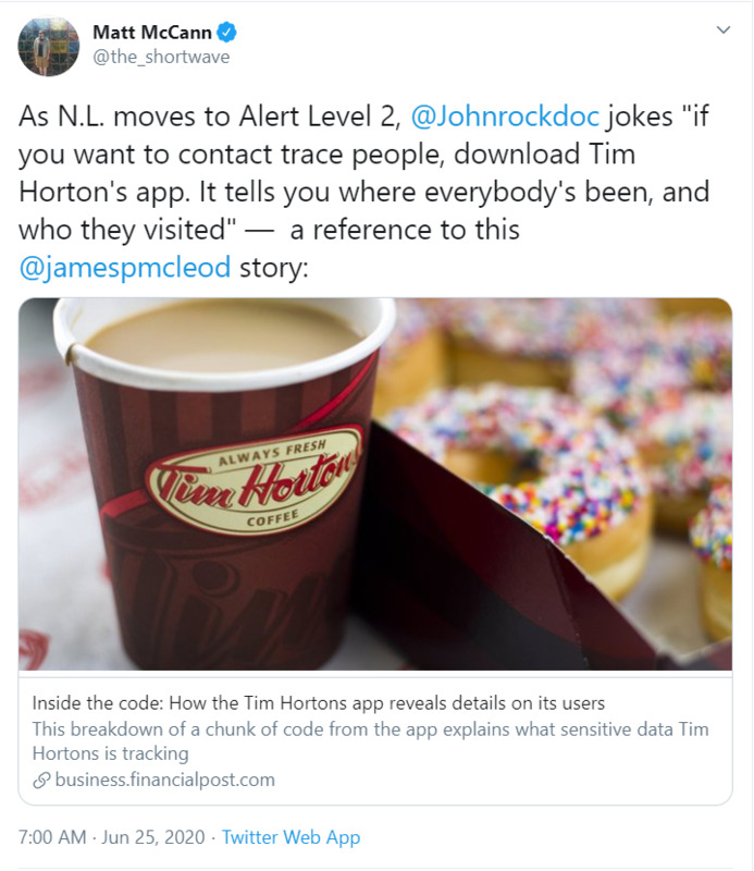 Tweet by CBC Newfoundland reporter Matt McCann reporting on a joke made by John Haggie, the MLA (MHA) for Gander, and provincial Minister of Health made about the scandal in which Tim Horton's was revealed to be extensively tracking those who use their application. The minister joked that they should use the Tim's app in place of a custom built contact tracing application for those with covid-19.