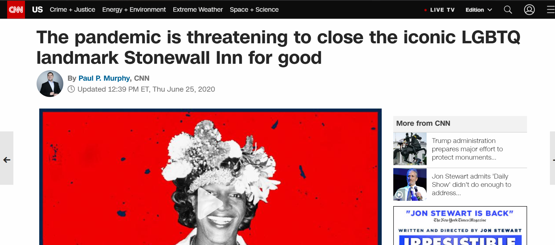 From the article: "It's not going to close tomorrow or the next day, co-owner Stacy Lentz told CNN, but the Stonewall Inn's future is in jeopardy. Payments for the bar's insurance and rent, in addition to normal operating costs, continue to mount even though coronavirus has closed their doors."