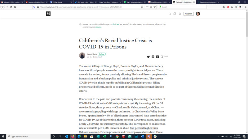 This article, written by three University of California professors, highlights the racial justice crisis inside US prisons. Due to their architecture and systems corrections facilities find it nearly impossible to keep covid-19 out or slow the spread of the disease. In California the incarcerated populations rate of covid is 650 percent higher than that of the general population of the state. Once introduced into a facility covid spreads rapidly due to overcrowding, lack of ability to social distance, and a shortage of soap and other cleaning supplies. While many people in the general public feel that inmates chose to commit a crime and therefor should do their time others argue that they should not be made to die for their crimes due to covid.