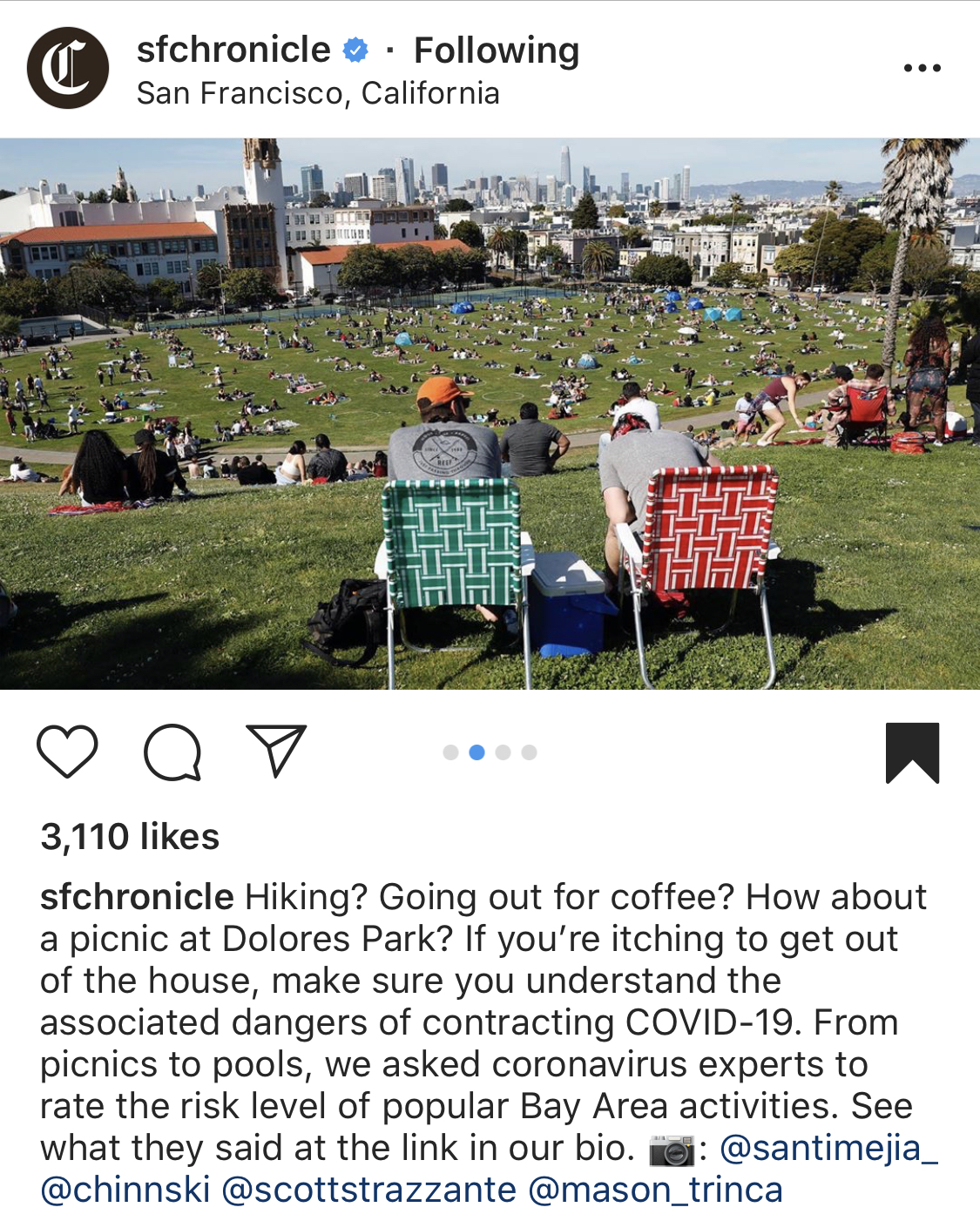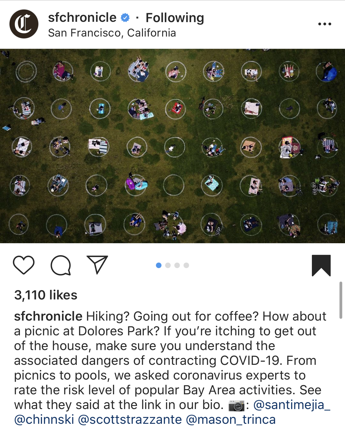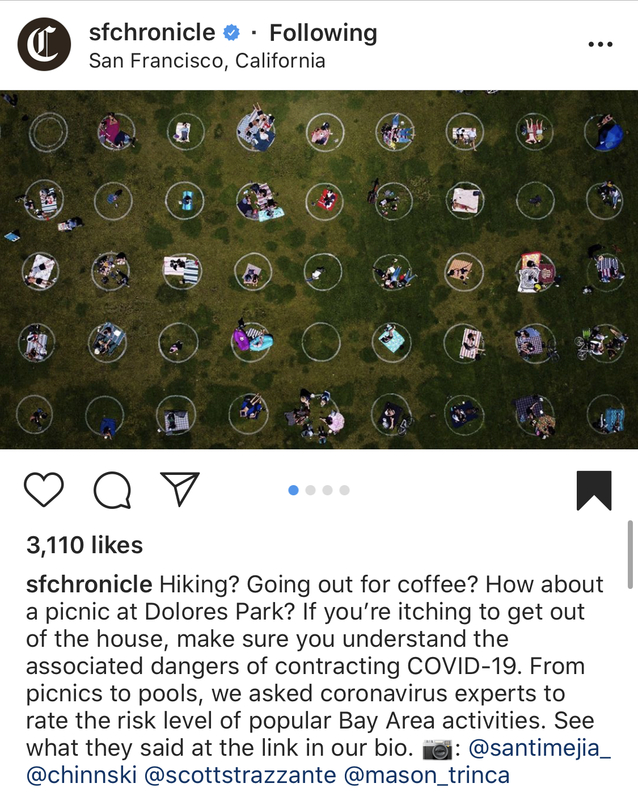 San Francisco parks are the cultural heart of the city. From Golden Gate Park to Dolores Park to Washington Square Park, each park has a unique personality. On a sunny day, which can be rare in this foggy city by the Bay, parks are typically full of locals sharing picnics, music and lawn games. A day at a San Francisco park when the sun is shining reminds many city dwellers of the reason why they continue to live in a city largely covered in fog for most of the year. As California began to lift the shelter-in-place orders at the end of May, San Francisco residents encountered social distancing circles. These circles were painted on the lawn of San Francisco's most popular parks to remind and encourage visitors to keep their distance from others during the COVID-19 pandemic. Both the San Francisco Chronicle and Reuters chose to highlight social distancing circles in San Francisco's famous Dolores Park. I am at once impressed by the measures the city is taking to encourage social distancing and the apparent respect that park patrons have for the social distancing circles. And also shocked at how many San Francisco residents are choosing to visit parks during a pandemic.