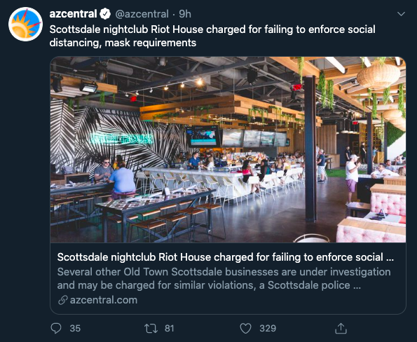 As a student at Arizona State, i personally frequented Old Town and Riot House as many students do, so to see criminal charges being brought against them caught my eye. Although it is unlikely the owners will face serious legal trouble, it is clear they placed profit over health. Places like Riot House and other nightclubs currently open during the pandemic likely served as super spreader hot spots. These hot spots also likely played a large role in why Arizona is currently a global covid hotspot. I personally know many friends and acquaintances who attended night clubs in Old Town and Mill Ave in the previous weeks who have now tested positive for the virus.