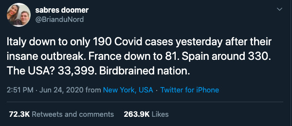 I included this tweet because it essentially sums up the current status of the virus globally. European nations are almost clear of the virus due to strict pandemic guidelines. Meanwhile the United States has taken the opposite approach and any hope for the pandemic being over soon is officially gone. What struck me about this tweet was remembering the public reaction when Italy was the center point of the virus, and the denial of the US ever getting that bad. Now the story of the pandemic has shifted dramatically.