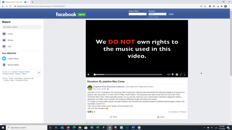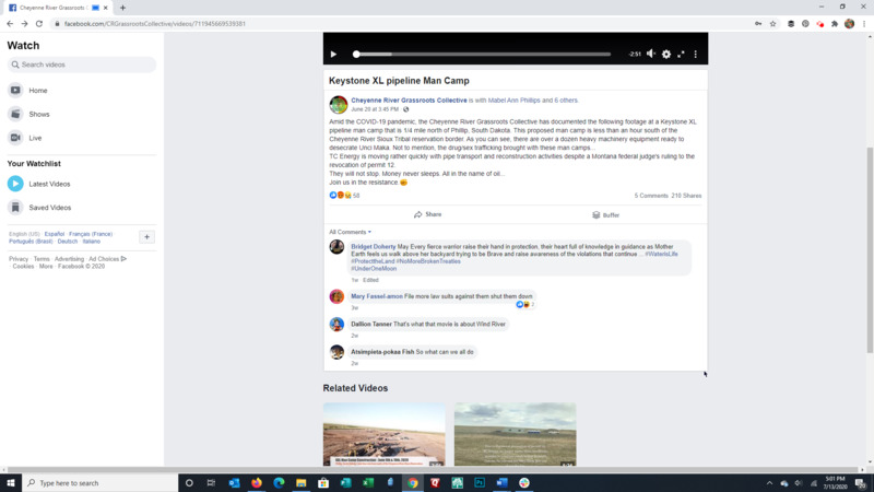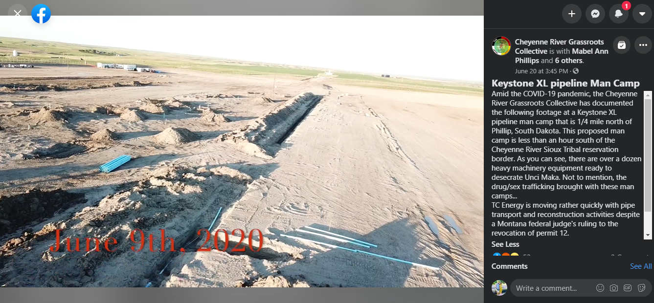 From the Cheyenne River Grassroots Collective: Amid the COVID-19 pandemic, the Cheyenne River Grassroots Collective has documented the following footage at a Keystone XL pipeline man camp that is 1/4 mile north of Phillip, South Dakota. This proposed man camp is less than an hour south of the Cheyenne River Sioux Tribal reservation border. As you can see, there are over a dozen heavy machinery equipment ready to desecrate Unci Maka. Not to mention, the drug/sex trafficking brought with these man camps...