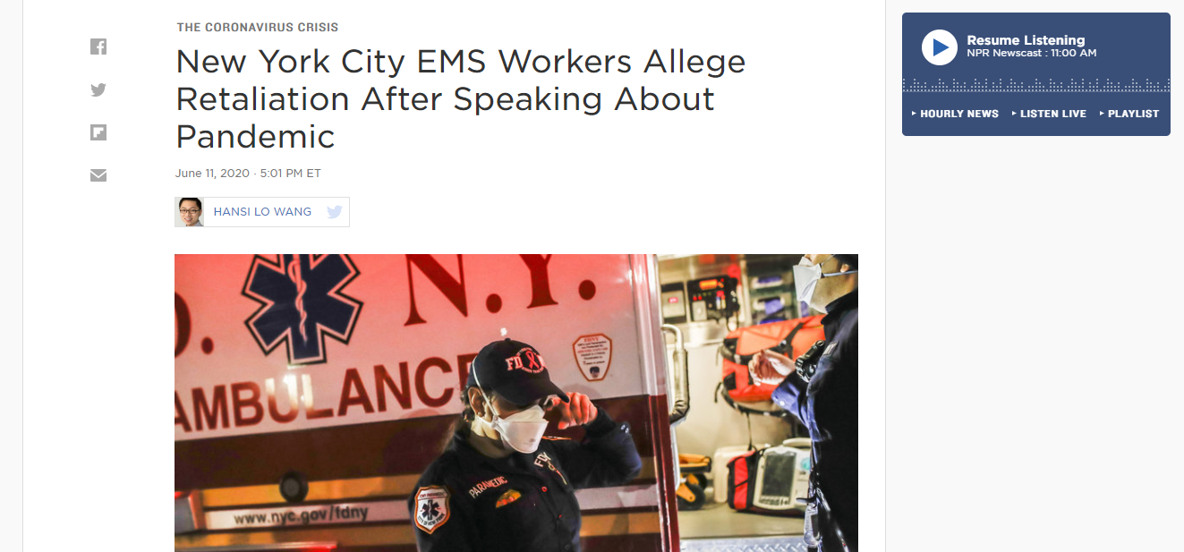 Excerpt for article: A group of New York City emergency medical service workers who gave interviews to the news media, including NPR, are suing the city for allegedly retaliating against them after speaking about their experiences responding to the COVID-19 pandemic.
