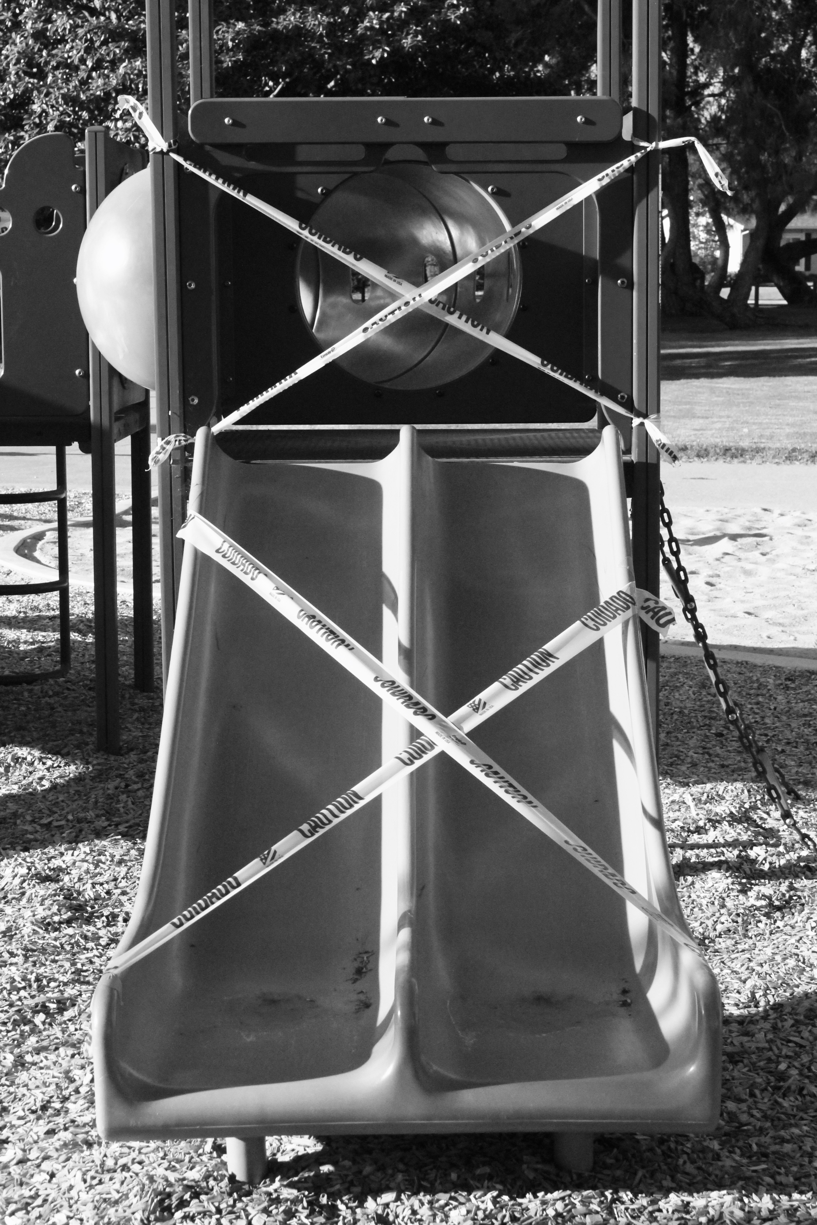 I saw the slide while on a walk in the morning. My local playground had been shut down and taped up to prevent children playing. I wanted to photograph it to show how the pandemic had changed even basic activities like taking children to a playground.