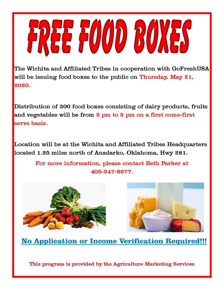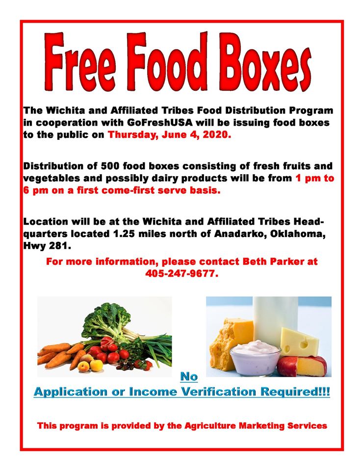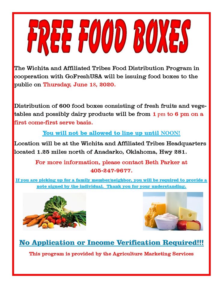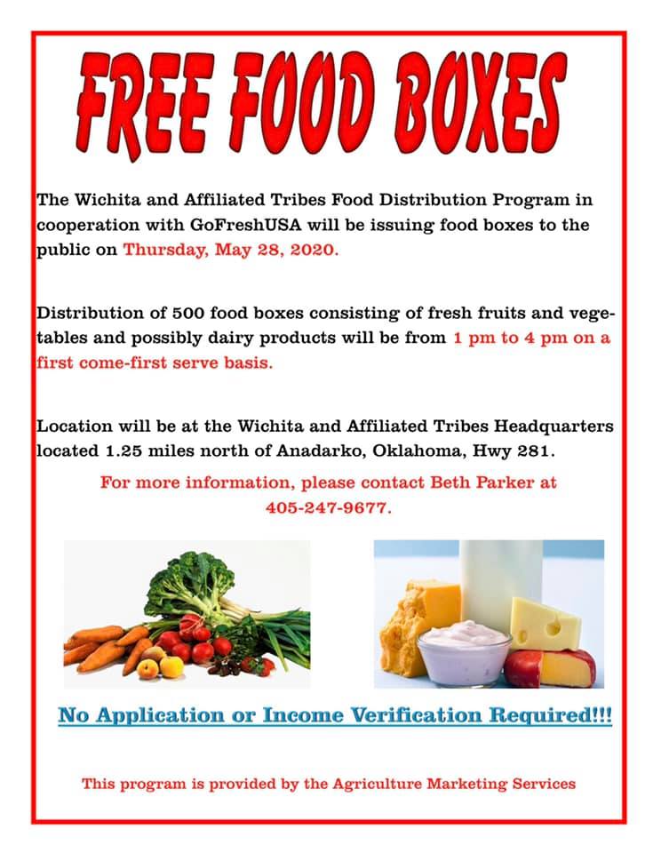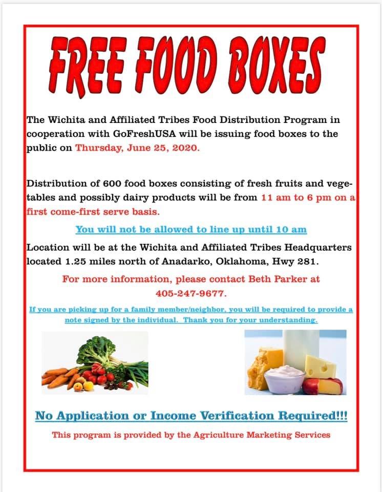 "The Wichita and Affiliated Tribes in cooperation with GoFreshUSA will be issuing food boxes to the public..."