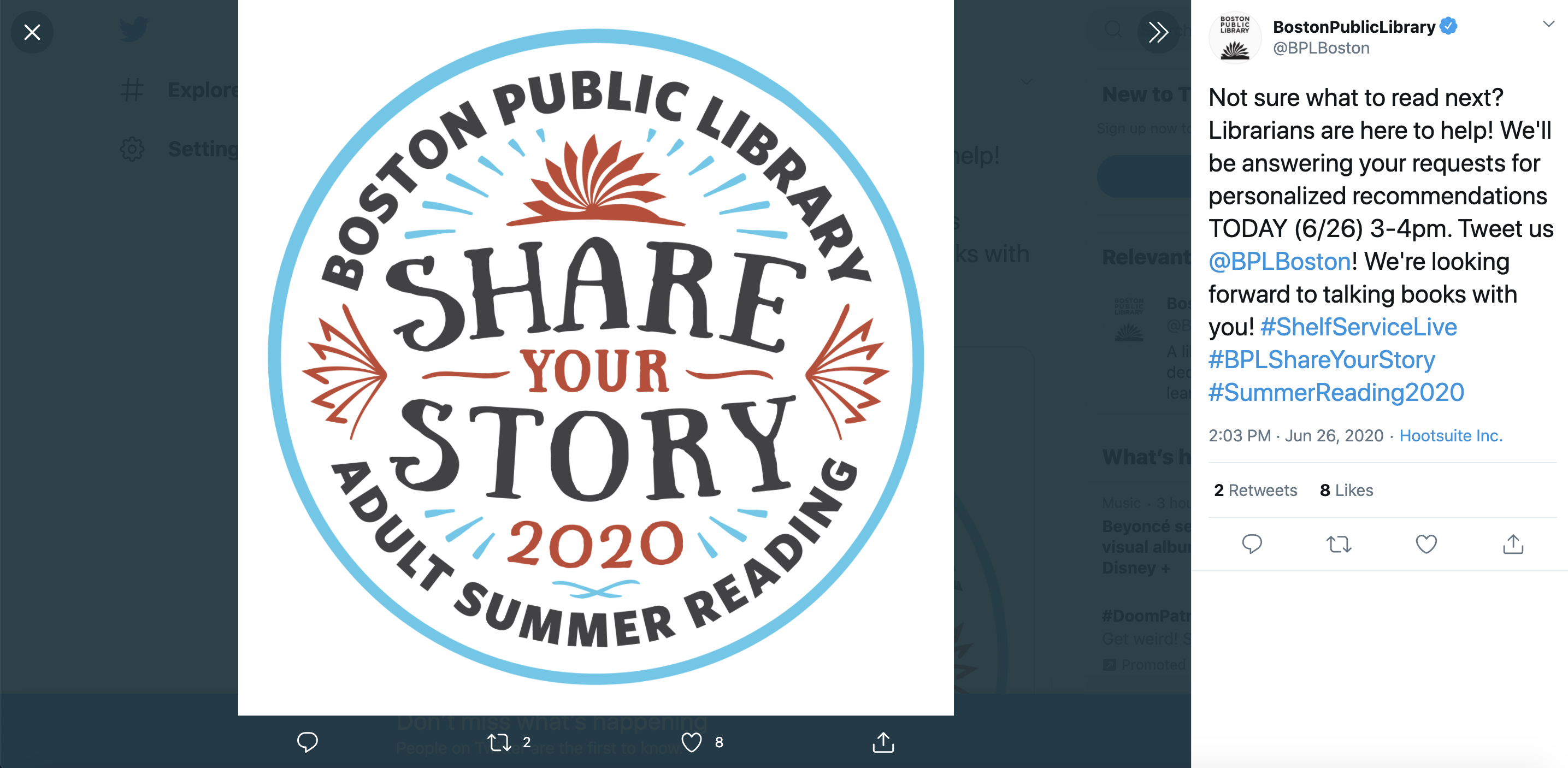 Twitter post from the Boston Public Library, as part of their campaign to promote adult summer reading. Post announces that for the day (June 26th), librarians will be responding on twitter to people asking for book recommendations. Because libraries are no longer able to operate out of their physical spaces, librarians have had to seek new ways to interact with their publics and fulfill their traditional duties. Posts like this emphasize new approaches that librarians are taking, as well as the increased role of social media in interactions between libraries and the public.