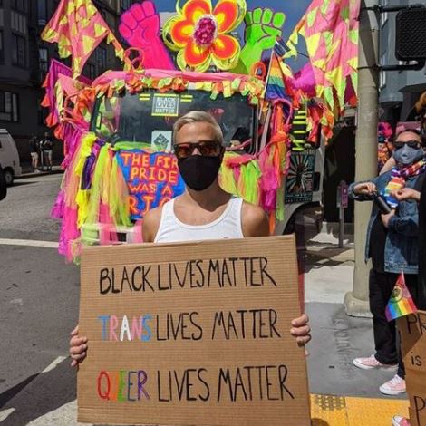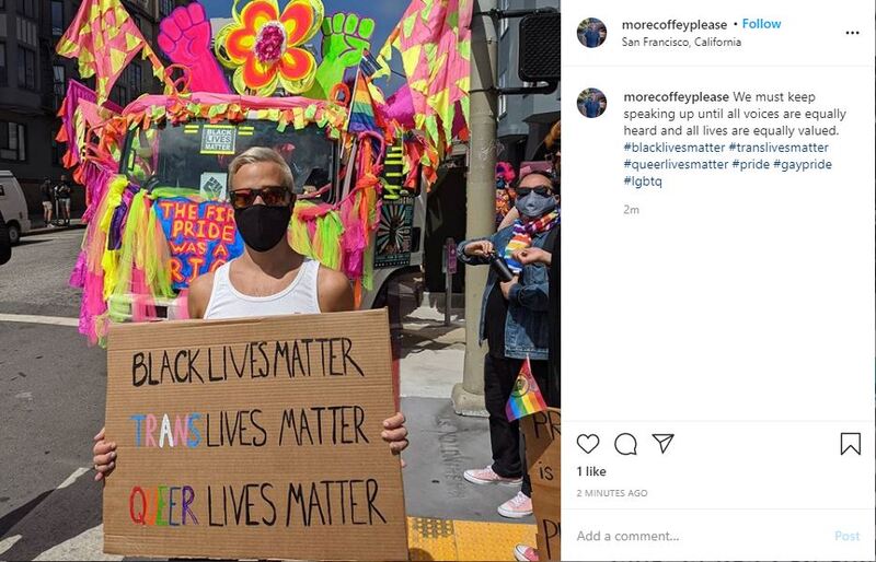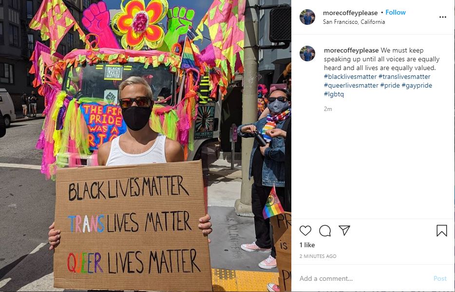 Tyler Coffey posted this vibrant image featuring a person holding a sign that reads "Black Lives Matter, Trans Lives Matter, Queer Lives Matter," while standing in front of a colorfully decorate van, on his Instagram account. There is also a sign on the front of the van that reads "The first pride was a riot." The person holding the sign, as well as another figure in the background, are wearing masks due to the COVID-19 pandemic. This photograph was posted during San Francisco's pride weekend, traditionally held the last weekend in June. Rainbow flags and other apparel items are clearly seen in the background.