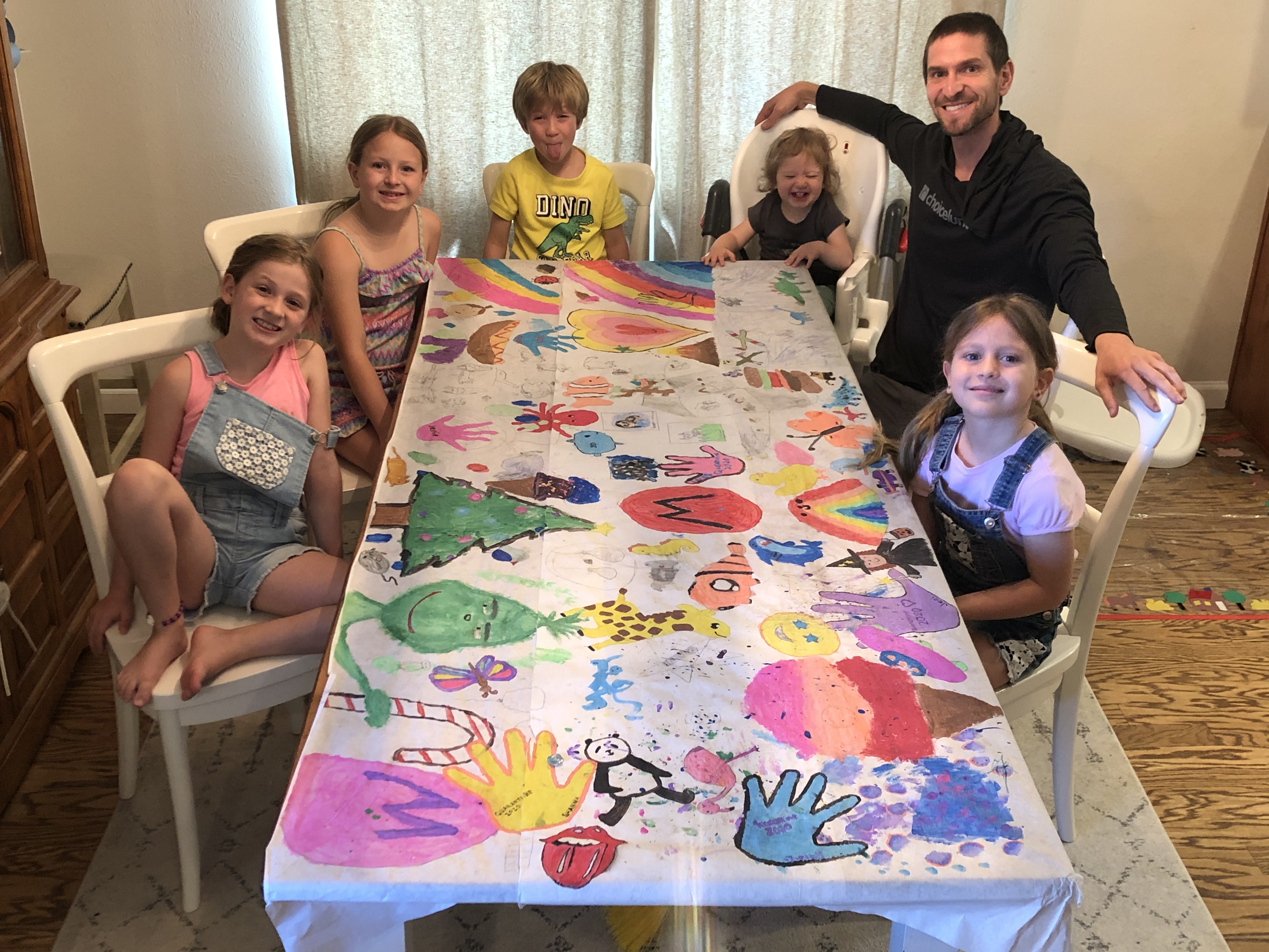 Trying to keep the family busy and happy during the shelter-in-place is a challenge. I unrolled a sheet of butcher paper on the kitchen table to occupy the kids one morning, and over the next few weeks, a mural emerged. All members of our family could be found sketching, painting, and coloring on the mural at random times until this beautiful mural was created.