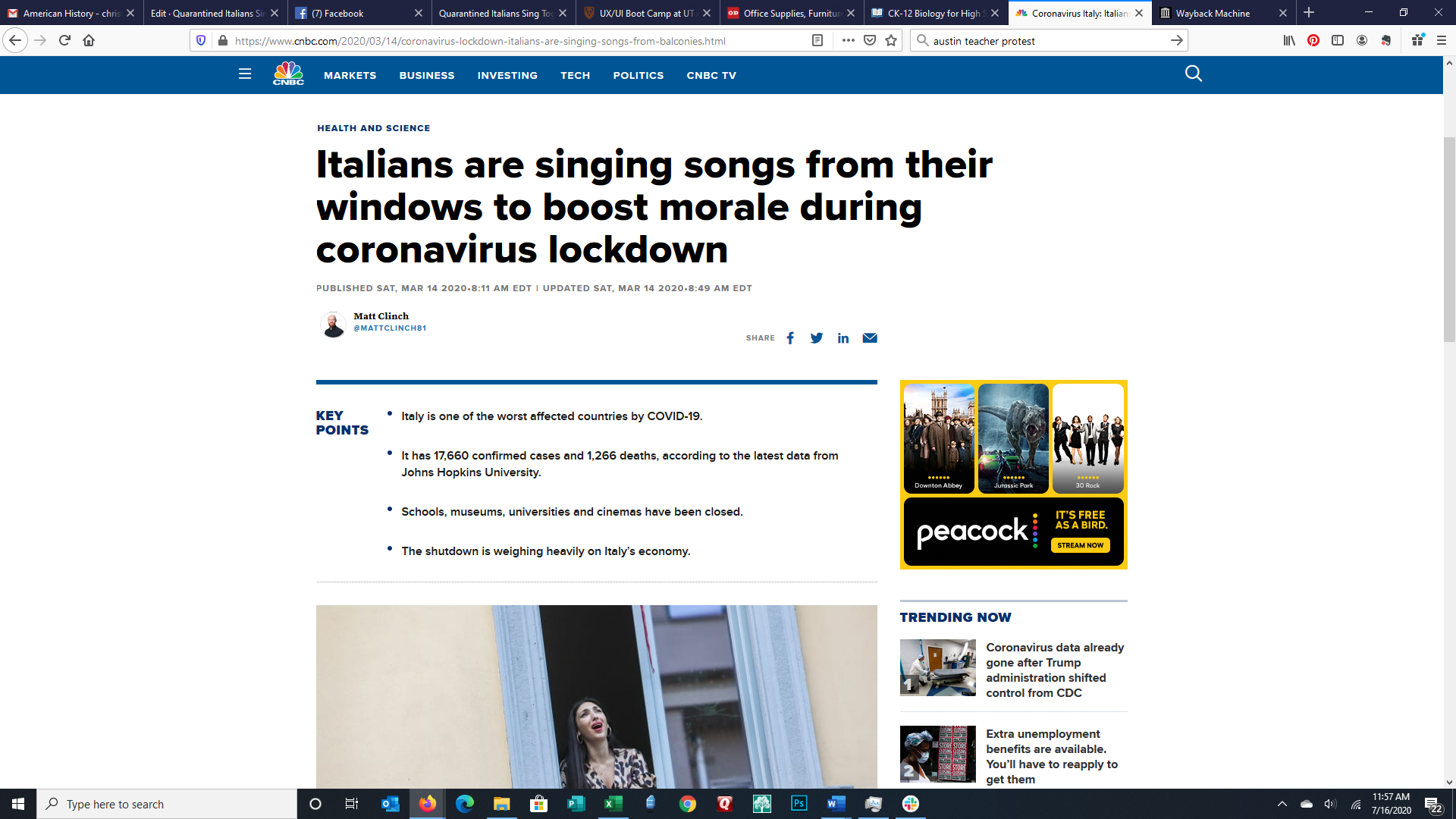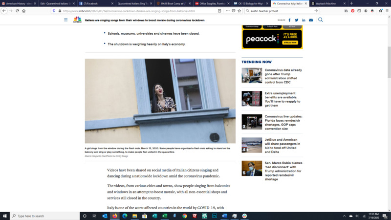 Before the Coronavirus came to the United States, all eyes were on Italy. They had the highest death rate ever and they were all in a very strict quarantine. They were able to release the stress of being cooped up in their small apartments by singing together while standing on their balconies. Some would play violins, accordions, or tambourines, while others sang. They all joined in and it was quite a unique experience, and the videos went viral.
