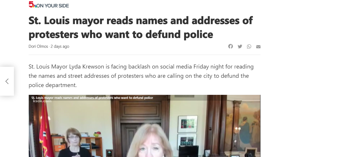 St. Louis Mayor Lyda Krewson is facing backlash on social media Friday night for reading the names and street addresses of protesters who are calling on the city to defund the police department.