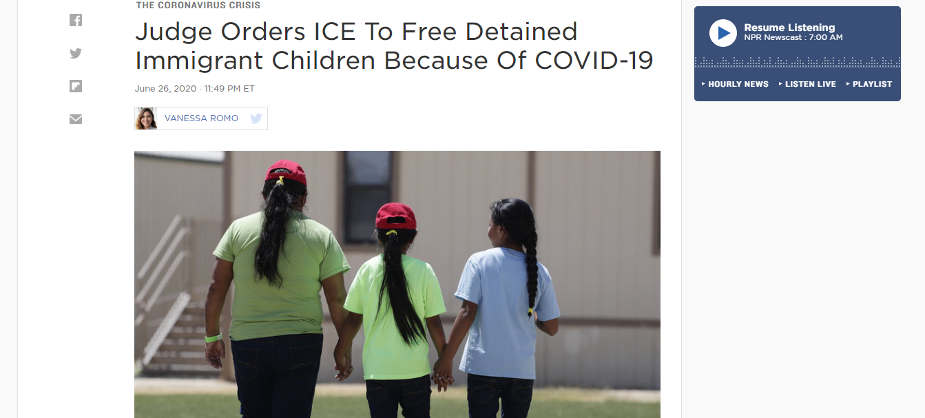 Excerpt from article: Citing the unrelenting spread of the coronavirus, a federal judge has ordered that all children currently held in U.S. Immigration and Customs Enforcement custody for more than 20 days must be released by July 17.