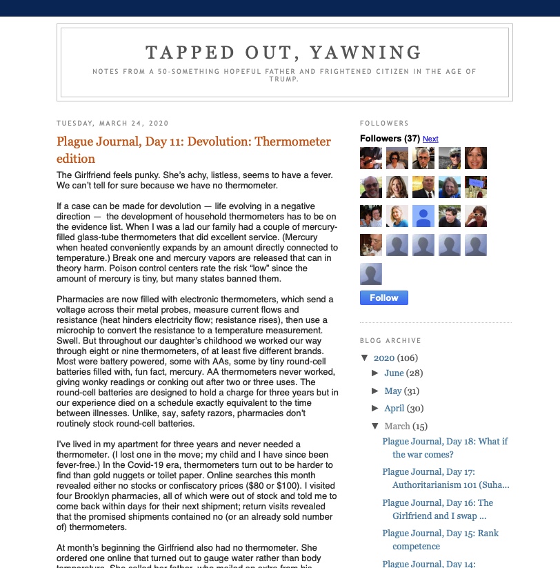 I'm keeping a Covid-19 journal. Here's the latest entry, including discussion on the devolution of the household thermometer: