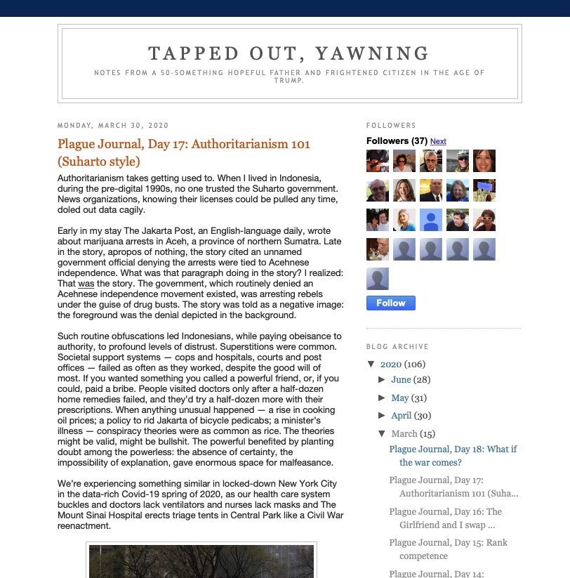 I'm keeping a Covid-19 journal. Here's the latest entry, with updates on my upstate friend (better!), further turns in The Girlfriend's condition, and thoughts on life under President Suharto.