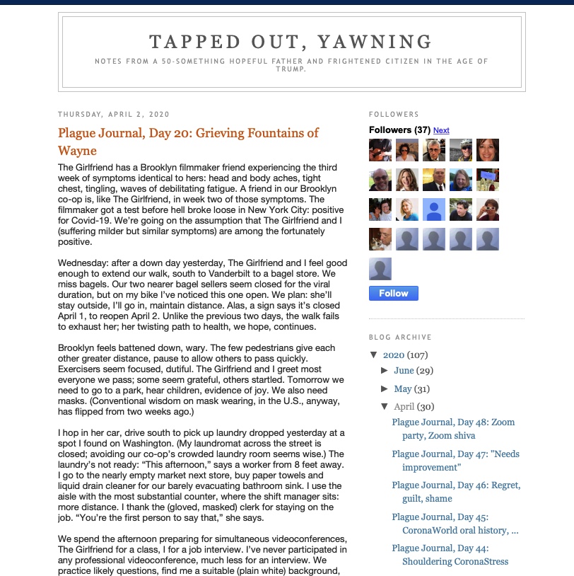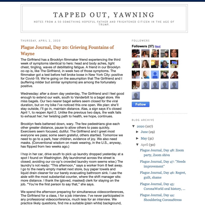 I'm keeping a Covid-19 journal. The latest entry discusses our amateur diagnosis of The Girlfriend; ambiguous grief; and a rash of death, including that of a top tunesmith.