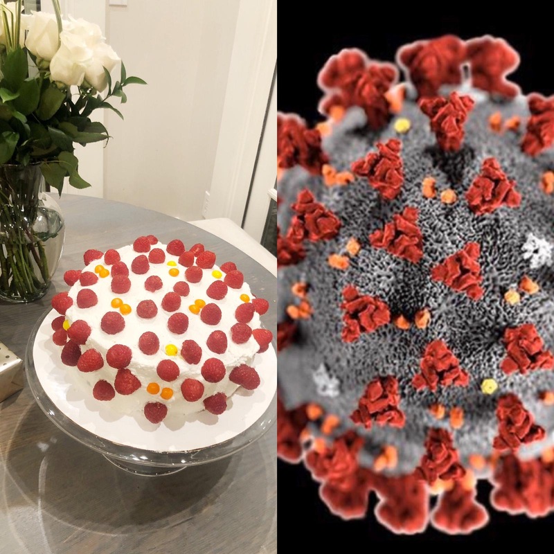 We consider our nanny to be part of our family and she was part of our quaran-team. Her April 22 birthday posed a particular challenge for a cake. We would normally visit Ambrosia Bakery, but with more time, we decided to bake it instead. With extra raspberries on hand and some Valentine’s candy about to go out the window, we threw together the SARS-CoV-2 cake to celebrate the unusual times of celebrating in quarantine.