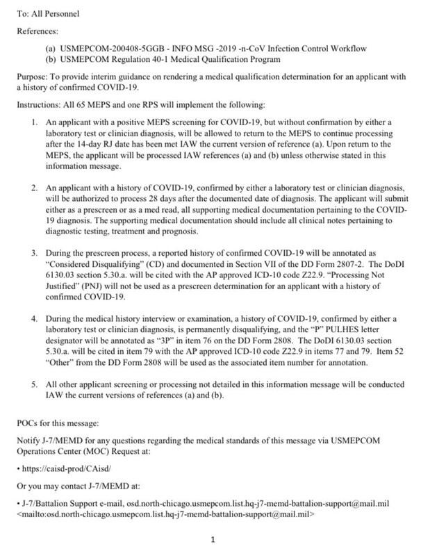 This memo from the United States Military Entrance Processing Command outlines certain guidelines for MEP stations to follow when testing and evaluating applicants for military service during the pandemic. One of its provisions specifically states that an established history of COVID-19 will be classified as a "permanently disqualifying condition," thus making the applicant unfit for induction.