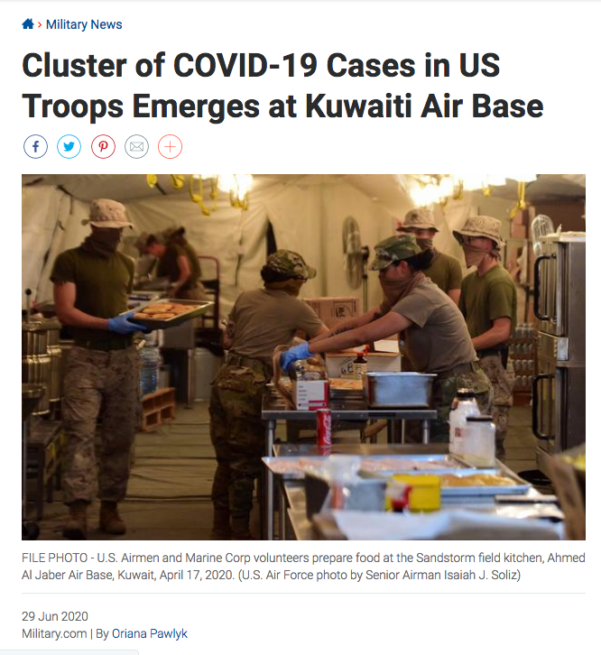 By infecting nearly every corner of the globe, COVID-19 further demonstrated its reach by invading the self-contained confines of US military bases, such as al-Jaber airbase in Kuwait. This screenshot, which features masked US Marines and airmen preparing a field kitchen, provides a glimpse into this self-contained world, with the headline revealing that nothing is immune to the coronavirus.
