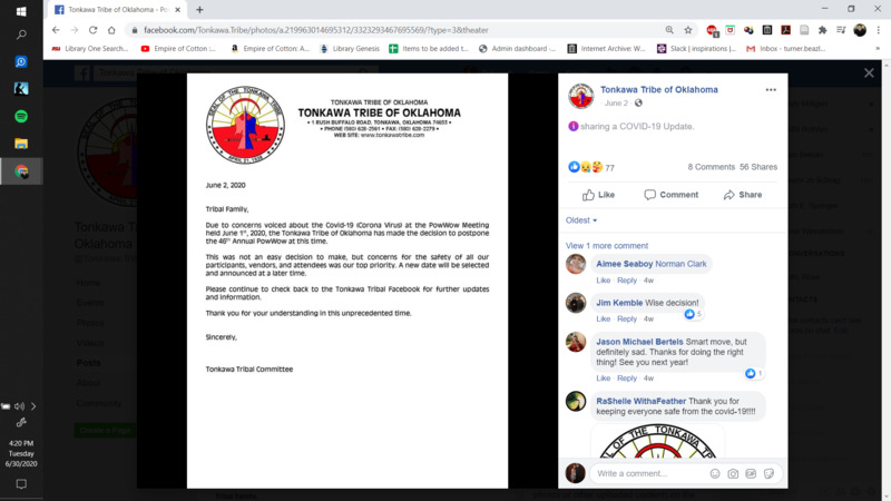 "Due to concerns voiced about the Covid-19 (Corona Virus) at the PowWow Meeting held June 1st, 2020, the Tonkawa Tribe of Oklahoma has made the decision to postpone the 46th Annual PowWow at this time."