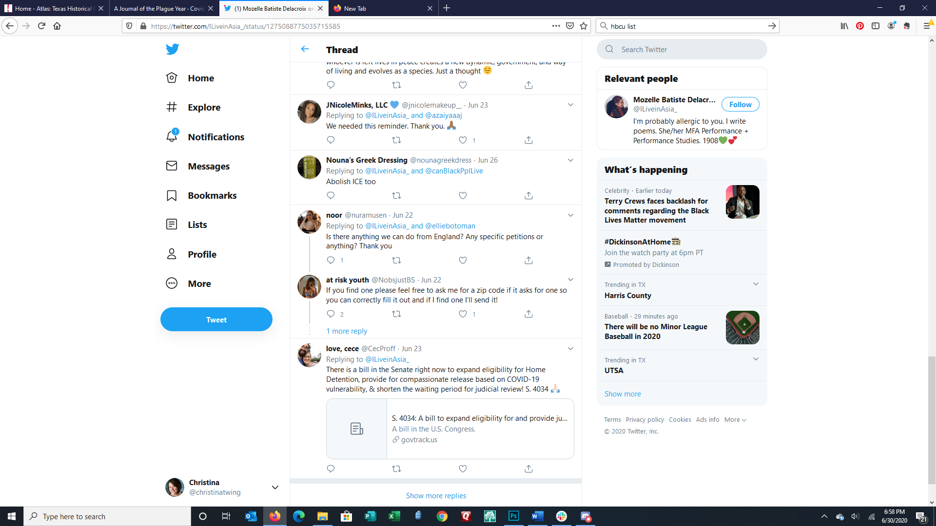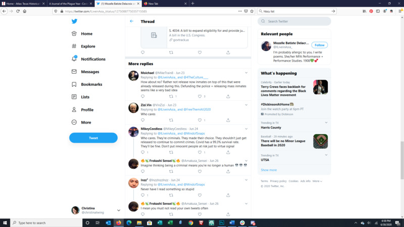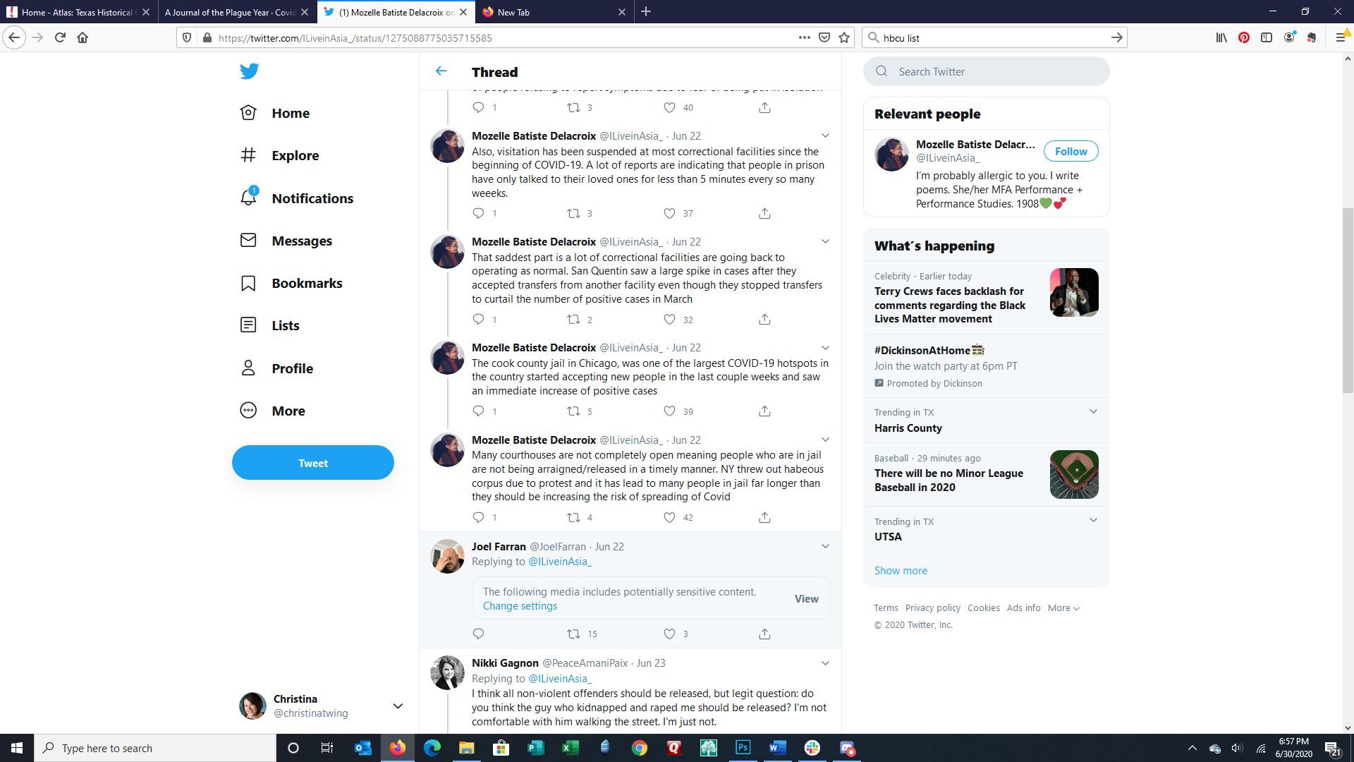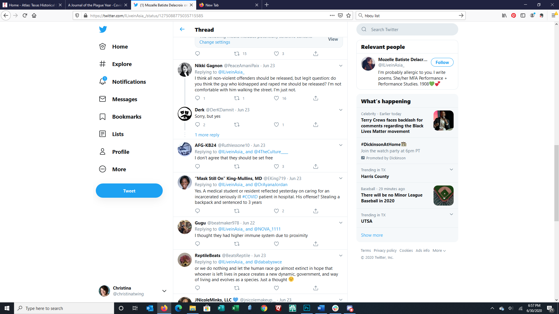 This is a Twitter post and replies discussing the risk of people in U.S. prisons and jails of dying from Covid-19. The main argument is whether incarcerated people should be released early or placed on house arrest so they can effectively prevent themselves from being exposed to covid-19 or does this present a public safety risk.