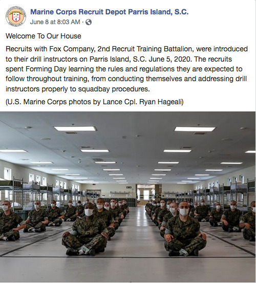 This screenshot from the United States Marine Corps Recruit Training Depot Parris Island Facebook offers a look into some of the adjustments the military has made in order to stem the spread of COVID-19 within its ranks. In a telling sign of the pandemic-era, these new recruits all wear protective masks in order to prevent possibly-infected water droplets from escaping into the air and triggering an outbreak within the barracks, an omnipresent threat, especially in boot camp.