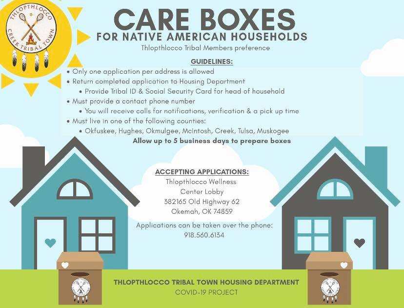 "The Housing Department COVID-19 Project is issuing applications for Care Boxes for Tribal Members. Heads of Households only should apply for each address if you live in one of the following counties:..."