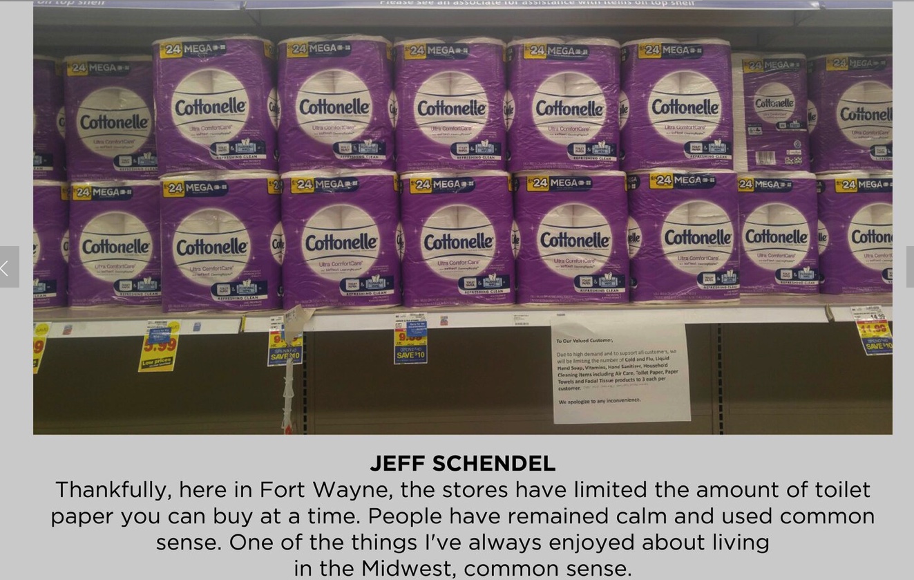 Thankfully, here in Fort Wayne, the stores have limited the amount of toilet paper you can buy at t time. People have remained calm and used common sense. One of the things I've always enjoyed about living in the Midwest, common sense.