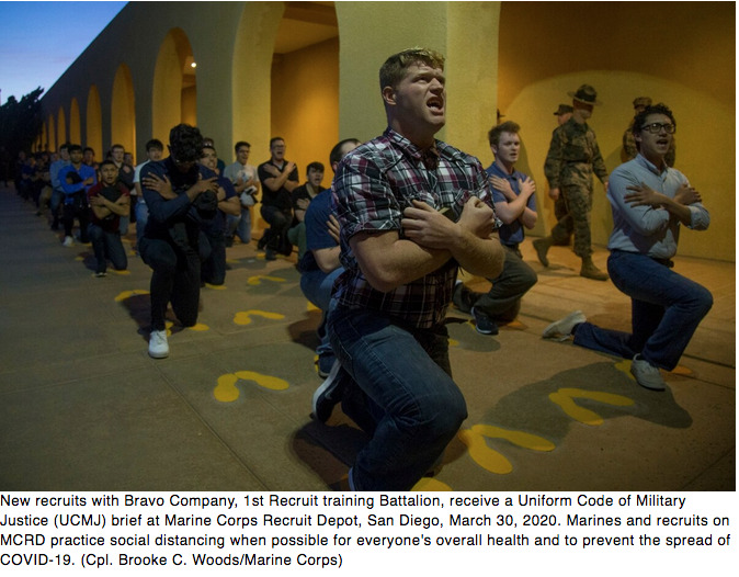 This screenshot showcases B Company, 1st Recruit Training Battalion's early morning reception at Marine Corps Recruit Depot San Diego (MCRD San Diego), the Marine Corps' basic training installation for all recruits enlisted west of the Mississippi River. With social distancing an integral measure to counter the coronavirus's advance, recruits appear to be staggered in formation so as to avoid shoulder-to-shoulder contact, as indicated by the empty yellow footprints that would normally be occupied four to a row. However, it must be noted that at this date, none of the recruits have masks, and neither do the receiving sergeants in the photo's background, therefore underscoring the difficulties of rapidly adapting to a novel infectious disease whose spread could have dire consequences in a military environment.