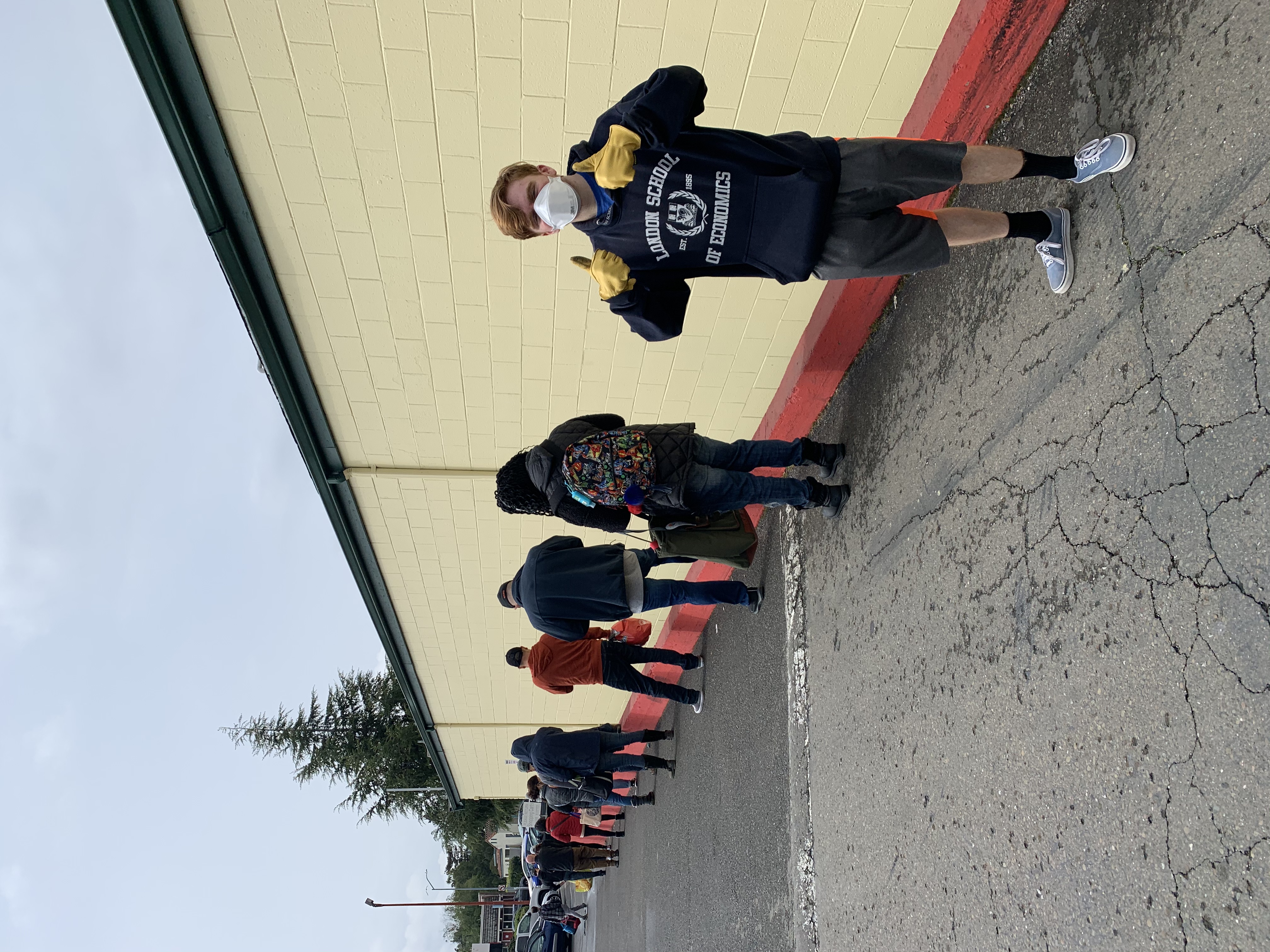 My son and I grocery shopping at Trader Joe's in Castro Valley - everyone knows the drill, you find the marker on the ground to tell you where to stand so you're 6 feet behind the person in front of you. You wear your mask. The line goes fairly quickly, and I've never heard anyone act entitled or complain. (note: I submitted this but I think the photo didn't attach)