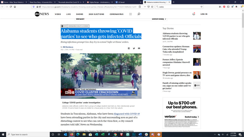 As covid cases explode across the U.S., especially in the southern and western portions of the country, young people in Tuscaloosa, Alabama are doing something unthinkable. They are hosting covid parties. While authorities thought this was a rumor upon first being notified, further investigation showed it was really happening. Unlike previous generations who held "chicken pox parties" in an effort to expose their children to the disease while they were young and less likely to suffer complications (prior to a vaccine being available) the covid parties do not appear to have any purpose other than entertainment. People are hosting parties and inviting people known to have the disease. Everyone then puts money in a pot and the first person to come down with covid gets the pot.