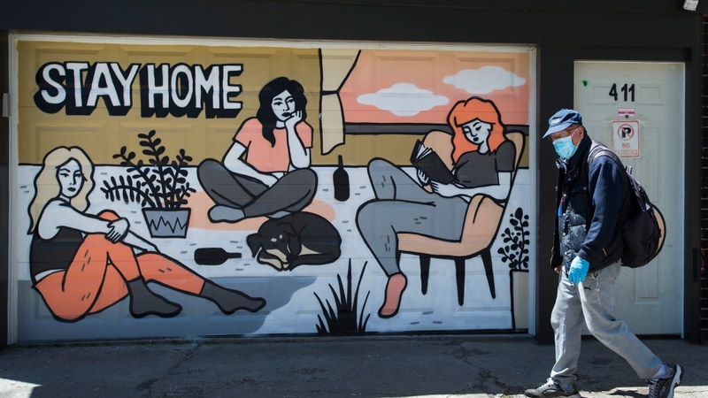 A mural somewhere in Toronto which features 3 female figures lounging in an apartment along with the words "STAY HOME"