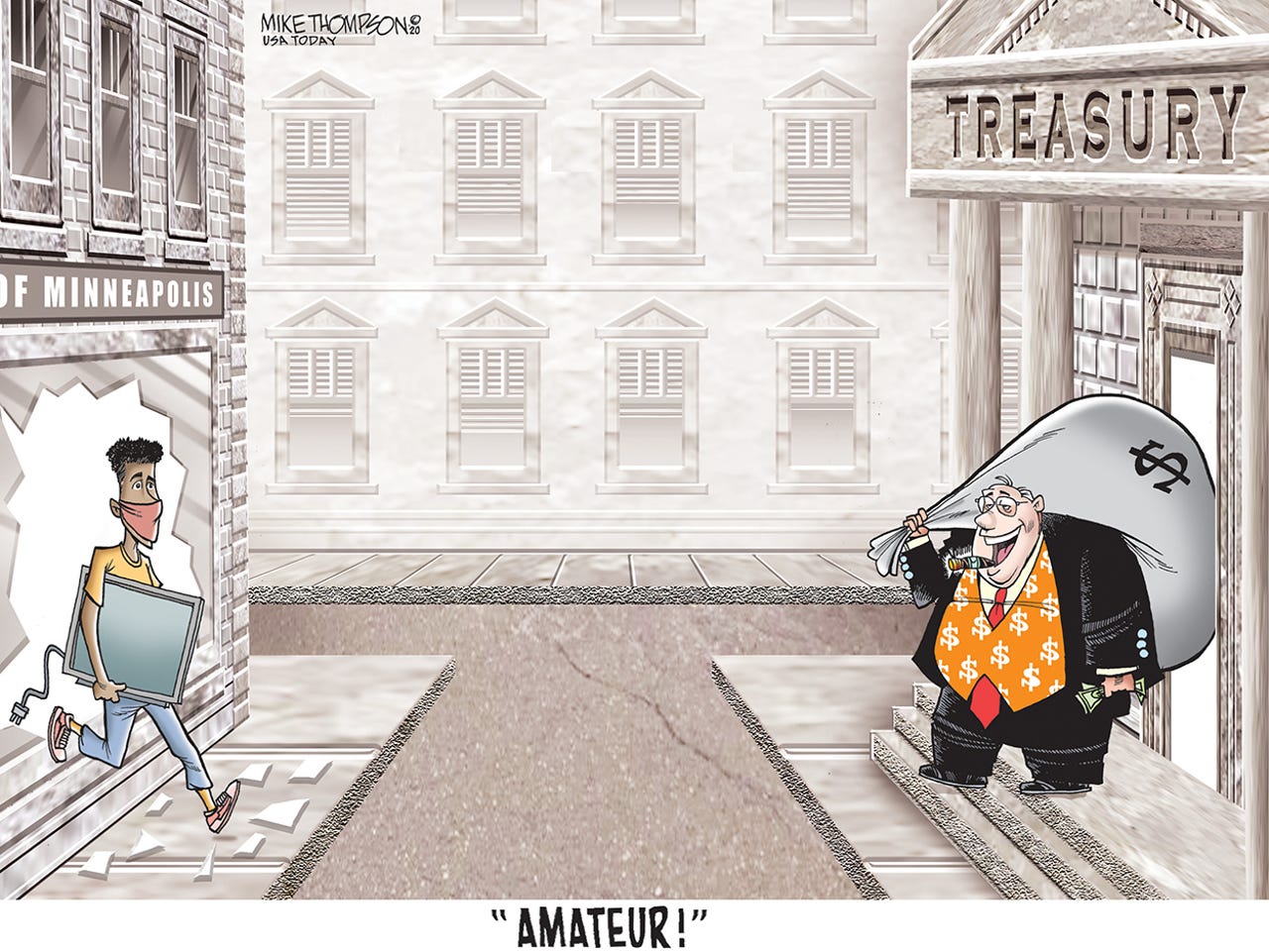 Picture depicts a young masked man stealing a TV, across the street from an older man wearing a suit leaving a bank stealing a large bag of money. The older man says to the younger man, "amateur".